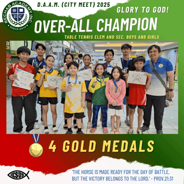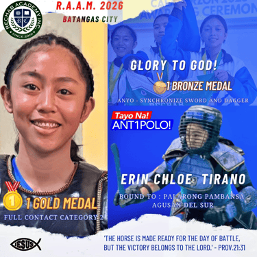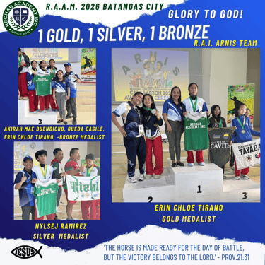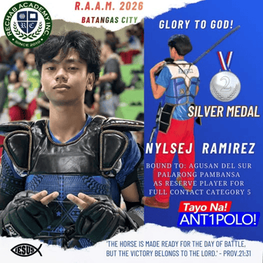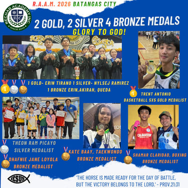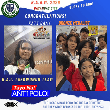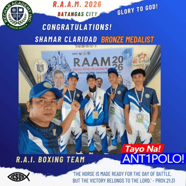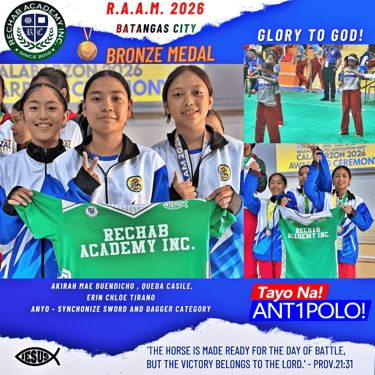 지난 3월 4일부터 14일까지 레갑아카데미(Rechab Academy) 학생 선수들이 지역 대표로 선발되어 바탕가스(Batangas)에서 열린 도대회에 참가하여 뛰어난 경기력을 선보이며 선전하였습니다. 이번 대회에는 레갑아카데미를 대표하는 다양한 종목의 학생 선수들이 출전하였으며, 리잘 지역을 대표하는 자격으로 참가하여 그동안 갈고닦은 실력을 유감없이 발휘하였습니다. 선수들은 대회 기간 동안 바탕가스 지역에 머물며 집중적으로 경기에 임하였고, 끝까지 최선을 다하는 모습으로 많은 이들에게 감동을 주었습니다. 결과 아르니스 종목에서 금메달 1, 은메달 1개, 동메달 1개를 획득하였고, 탁구에서는 은메달 1개, 동메달 1개, 그리고 태권도 및 권투에서 각각 동메달 1개씩을 획득하였습니다.